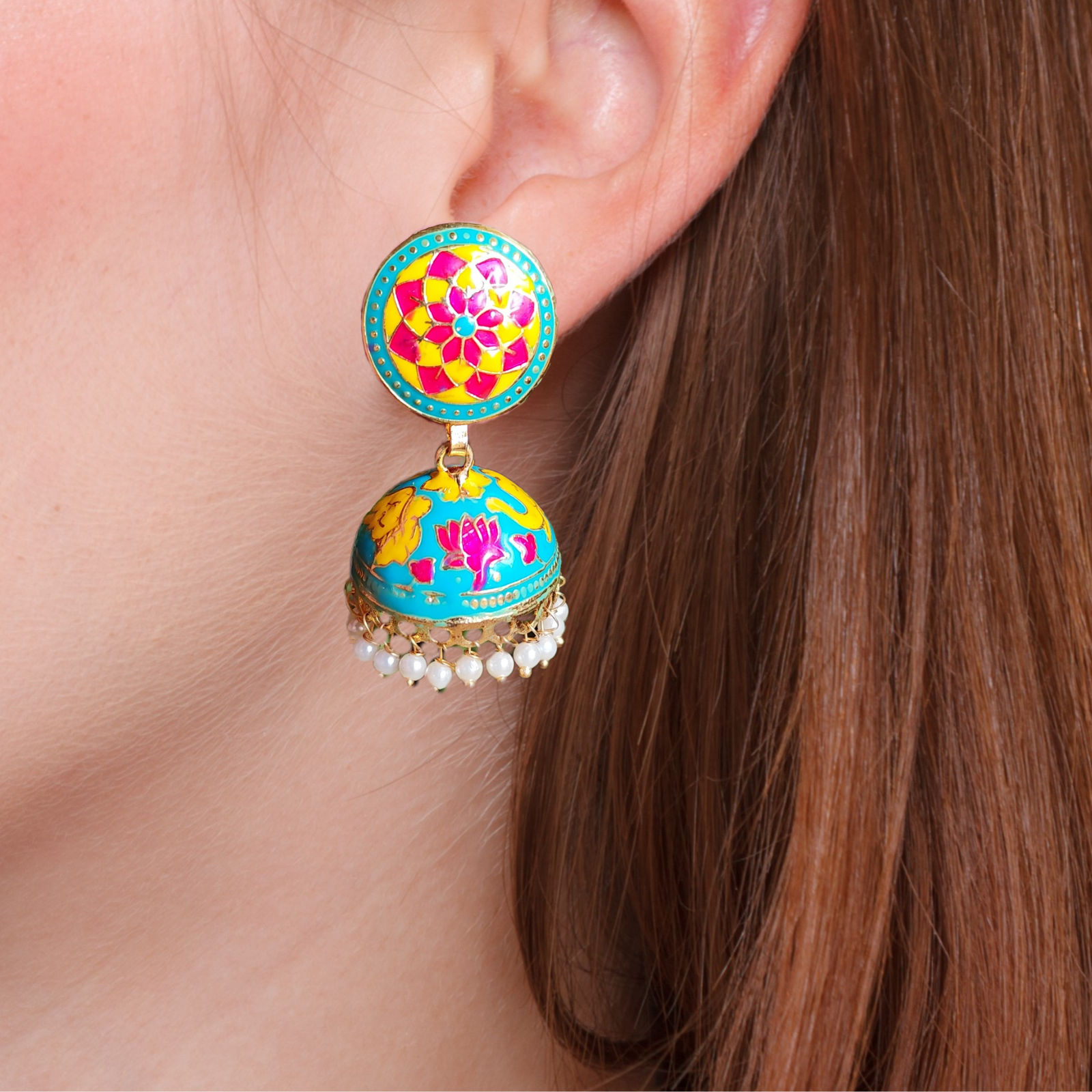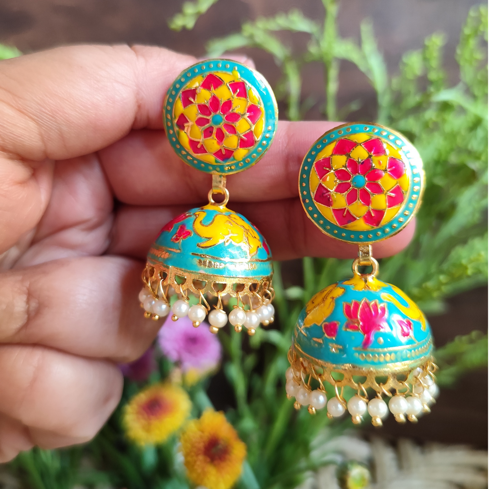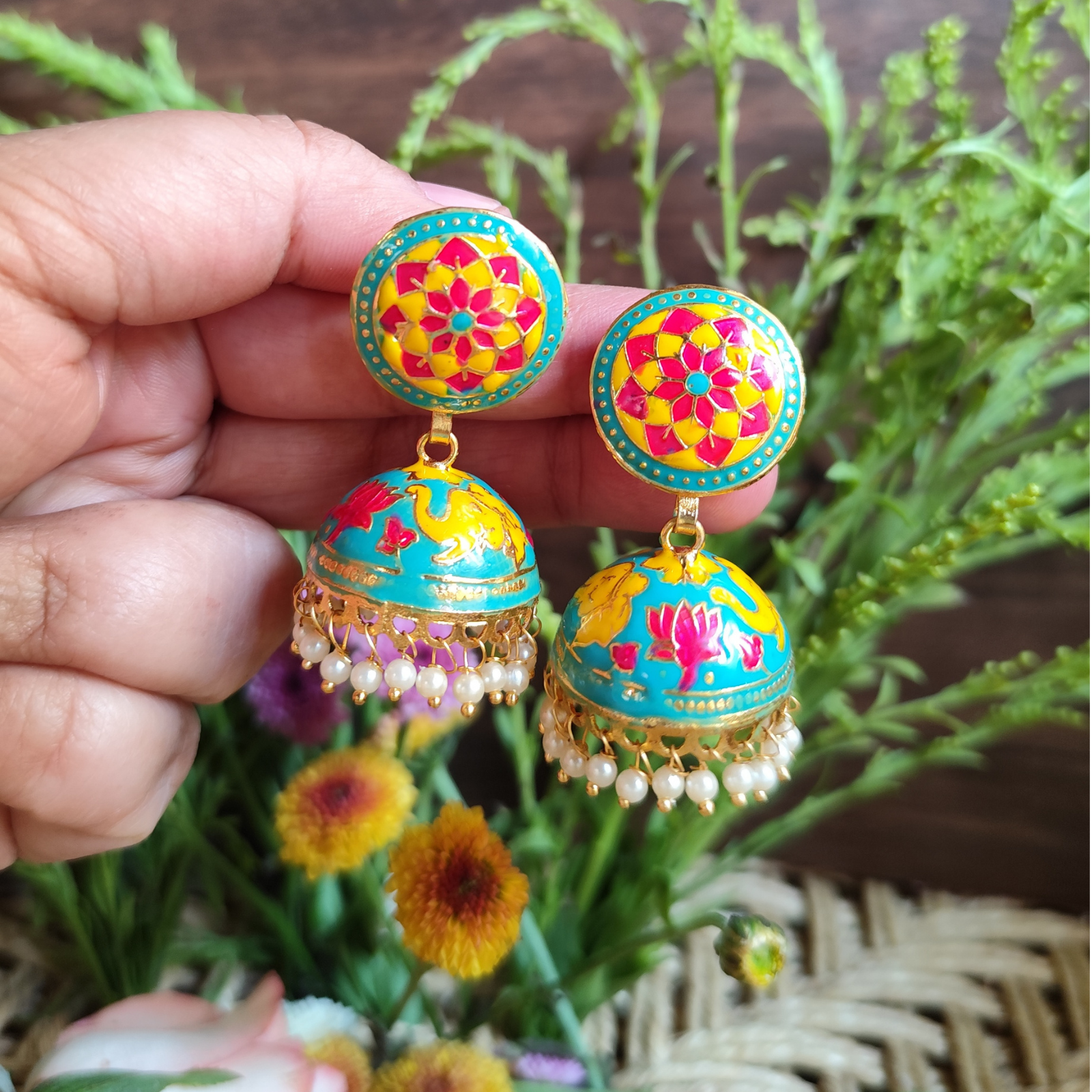 Teal Blue Vibrant Floral Meenakari Jhumki: Ethnic & Modern Flair!